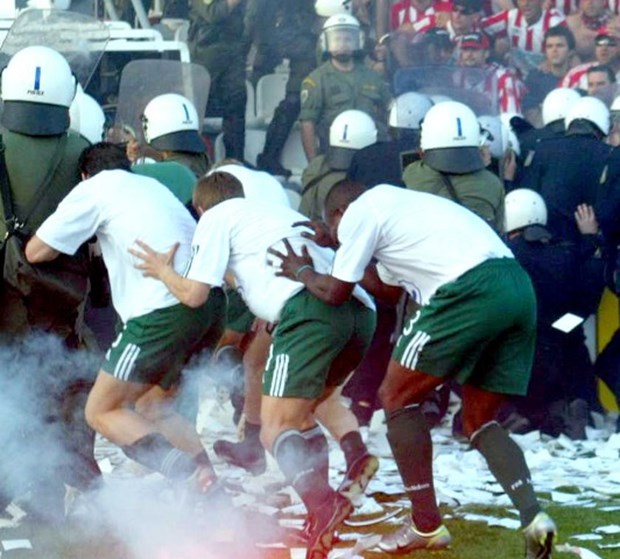 Από τη διοίκηση του Παναθηναϊκού δεν εμφανίστηκε κανένας στη Ριζούπολη. (στη φωτό έντρομοι παίκτες του Παναθηναϊκού μπαίνουν τρέχοντας στα αποδυτήρια πριν την έναρξη του ματς). Είχαν τόσο πολύ φοβηθεί τη συντριβή που απέφυγαν να δουν το ντέρμπυ και από την τηλεόραση.