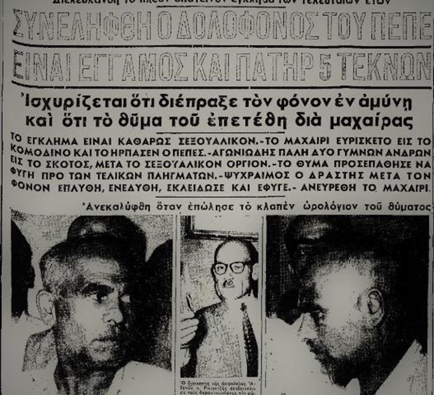 Μια περίεργη δολοφονία συντάραξε την Αθηναϊκή κοινωνία στα τέλη της δεκαετίας του ΄50. Σε ένα σπίτι στον Κολωνό, κλειδωμένο, χωρίς να υπάρχουν σημεία παραβίασης, βρέθηκε με 18 μαχαιριές ένας άνδρας 45 ετών ονόματι Δημήτρης Πεπές, σιδηροδρομικός υπάλληλος, έγγαμος με ένα παιδί.