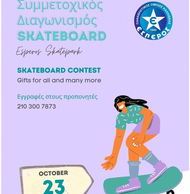Ο ΠΟΚ ΕΣΠΕΡΟΣ υπο την αιγιδα του Δημου Καλλιθεας διοργανωνει Συμμετοχικο Αγωνα SkateboardΟ αγώνας αποσκοπεί στην καλύτερη γνωριμία των παιδιών με το Skateboard.Περισσότερα...